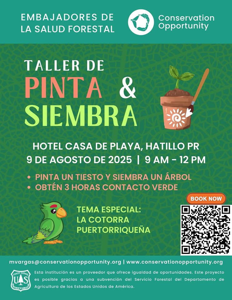 Conservation Opportunity, Inc. Te invita a que guardes tu espacio para nuestro cuarto taller educativo donde pintarás tu propio tiesto y sembrarás en él un árbol nativo de Puerto Rico. Además, registraremos el árbol en la aplicación Healthy Trees Healthy Cities como parte del inventario forestal, contribuyendo al monitoreo y......